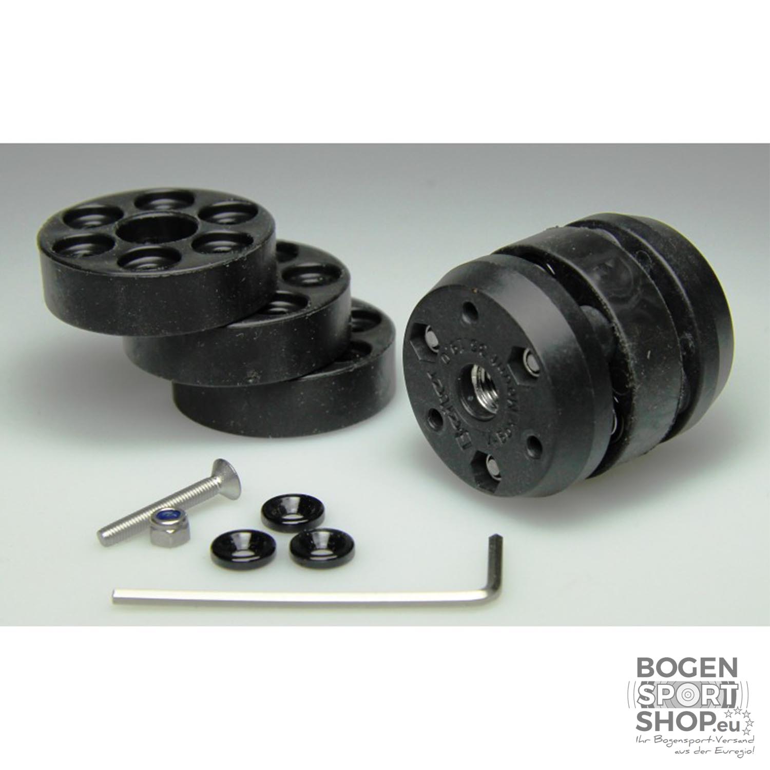 Der Clou an der Sache ist: Man bekommt nicht nur einen Dämpfer, sondern ein Kit mit 4 verschiedenen Gummiplatten unterschiedlicher Härte. Mit diesen kann man spielen und die Dämpfung des Bogens nach Zuggewicht oder eigenen Vorlieben zielgenau einstellen.