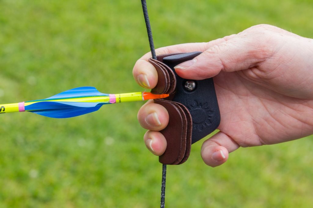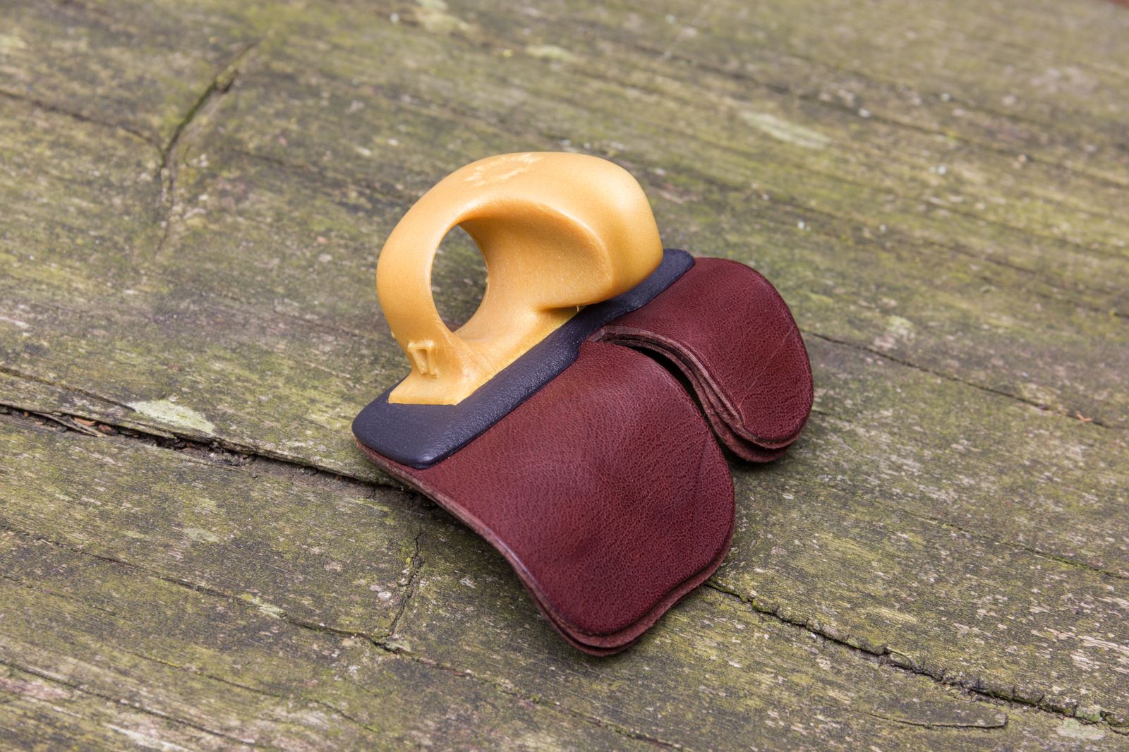 Die drei Lagen aus Känguruleder haben mich anfangs etwas verwirrt: Warum gleich 3? Ist das nicht zu dick bei meinen 30 Pfund Zuggewicht auf den Fingern? Auch hier zeigt sich, dass Fairweather mitdenkt – das Leder hat eine glatte und eine etwas rauere Seite. Davon sollen die zwei Schichten zur Sehne hin glatt und die letzte auf dem die Finger liegen umgedreht werden. So ist immer nur die Glatte Seite im Kontakt, um Reibung und Verschleiss zu reduzieren. Die größte Überraschung und Bonuspunkt zeigte das Tab hinsichtlich dem Einschießen. Mit Cordovanleder nehme ich mir mindestens drei Trainingseinheiten Zeit das Leder weicher zu machen. Drei Schichten von Känguruleder waren bereits nach der ersten Passe eingeschossen und mussten nur noch etwas hier und da getrimmt werden.