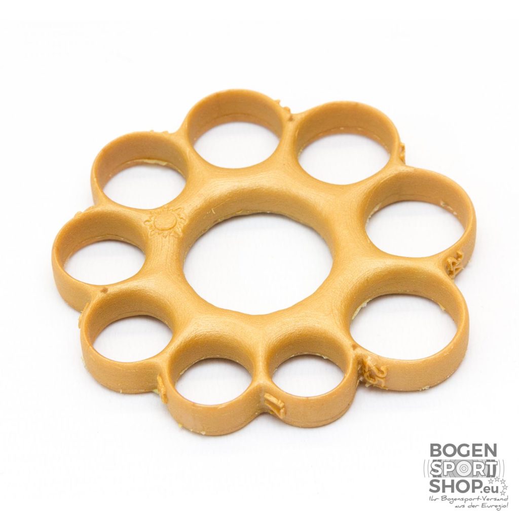 Obwohl die Individualisierungsmöglichkeiten wie oben beschrieben nicht groß erscheinen, liegt die Vielfalt doch im Detail: Zuerst probiert der Schütze/die Schützin den Messring. Selbst bei bekannter Ringgröße lohnt sich das, da bei der Breite des Fingertrenners meißt eine Nummer größer besser passt. In Verbindung mit der Ringgröße bestellt man sich nun das Leder mit der Grundplatte. In meinem Fall war bei der kleinsten Ringgröße von 17 die Plattengröße S klar.