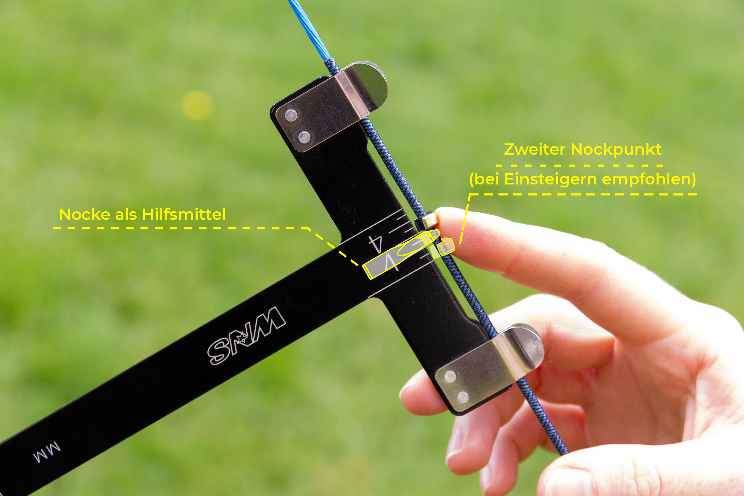 3. Auf der Skala des Checkers bei der Sehne seht ihr nun Markierungen. Diese können je nach Checker unterschiedlich aussehen. Man kann bis zu zwei Nockpunkte an der Sehne befestigen (bei Anfängern empfohlen). Der wichtigere Nockpunkt ist der Obere, denn dieser verhindert, dass der Pfeil nach oben rutscht.