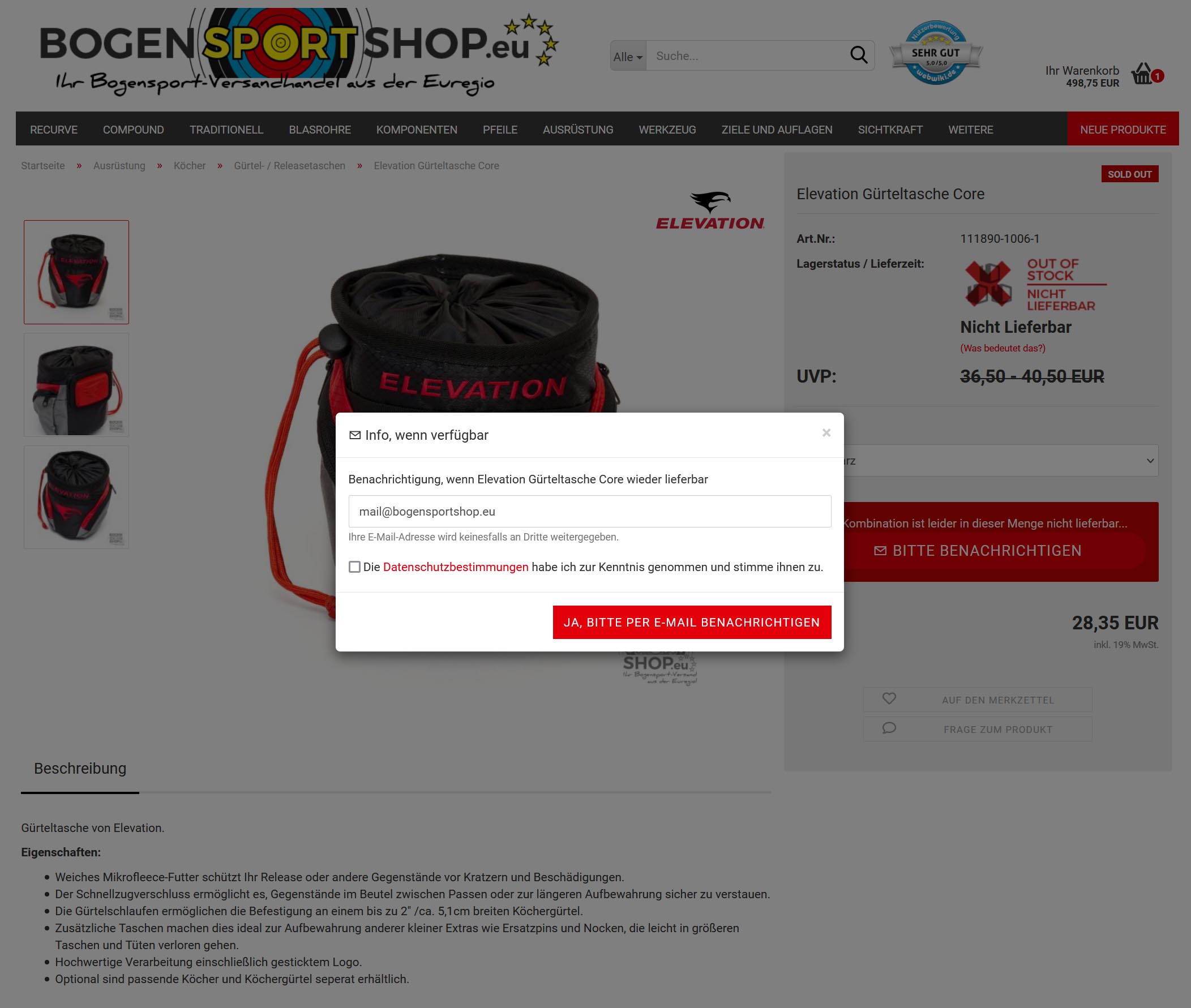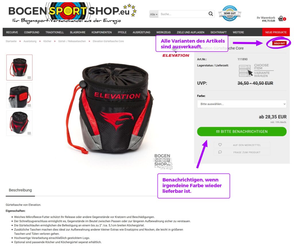 So sieht es aus, wenn ein Artikel mit Varianten komplett ausverkauft ist: