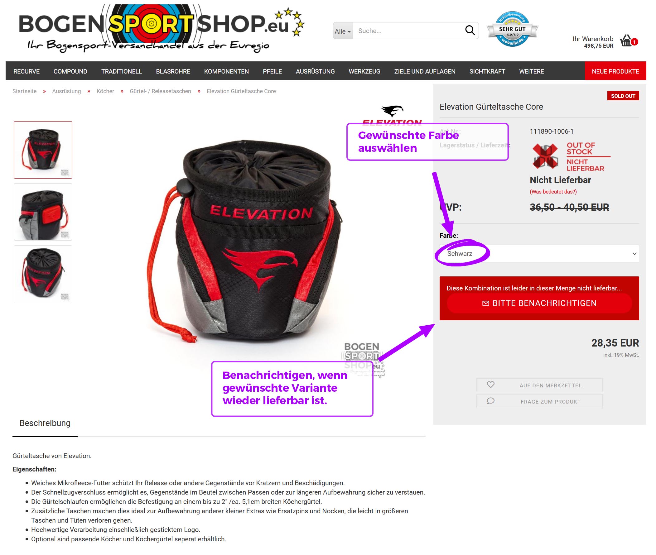 Der grüne Button „Bitte Benachrichten“ erscheint statt dem üblichen „In den Warenkorb“-Button. Da noch keine Variante ausgewählt ist, wird die Benachrichtigung gesendet, wenn irgendeine der Farben wieder lieferbar ist.