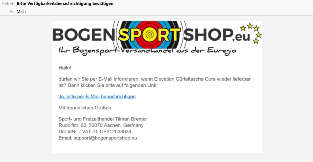 Wenn Sie eine andere Email-Adresse als die von ihrem Kundenkonto angeben, oder wenn Sie gerade nicht eingeloggt sind, müssen Sie die Benachrichtigung noch einmal über einen Link bestätigen (Double Opt-In):