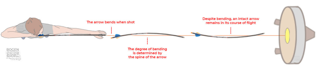 We note: The strength of the bow causes the arrow to bend. The spine of the arrow specifies the degree of bending. The arrow must be neither too soft nor too hard, depending on the draw length and draw force. If the spine fits as far as possible, the arrow will remain in its shooting line even though it’s been bending.