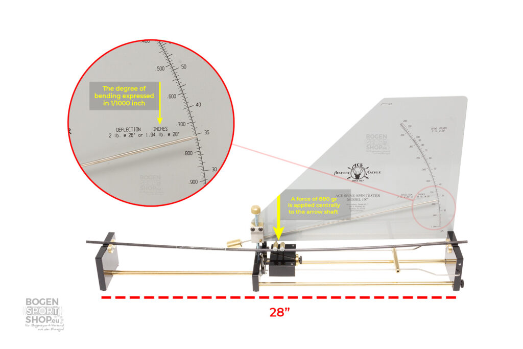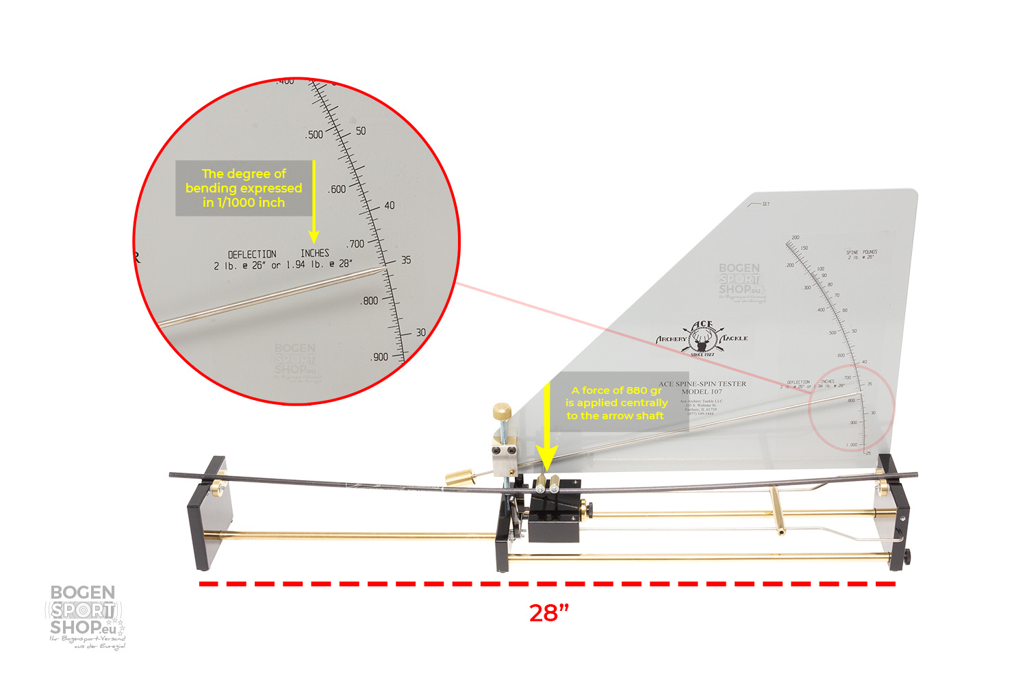 For the measurement of the spine, there are so-called spine testers (in our example, a model from ACE), where an bare arrow shaft is placed on two support points, which have a distance of 28″ from each other (according to the AMO standards, this distance is only 26″ for wooden arrows). A weight of 880 g is hung on the center of the arrow. Depending on how much the arrow deflects now reveals how soft, or hard the arrow is. This deflection is given in 1/1000 of an inch. A spine of 500 means that the arrow is deflected by 0.500 inch. 1200 would mean a deflection of 1,200 inches.